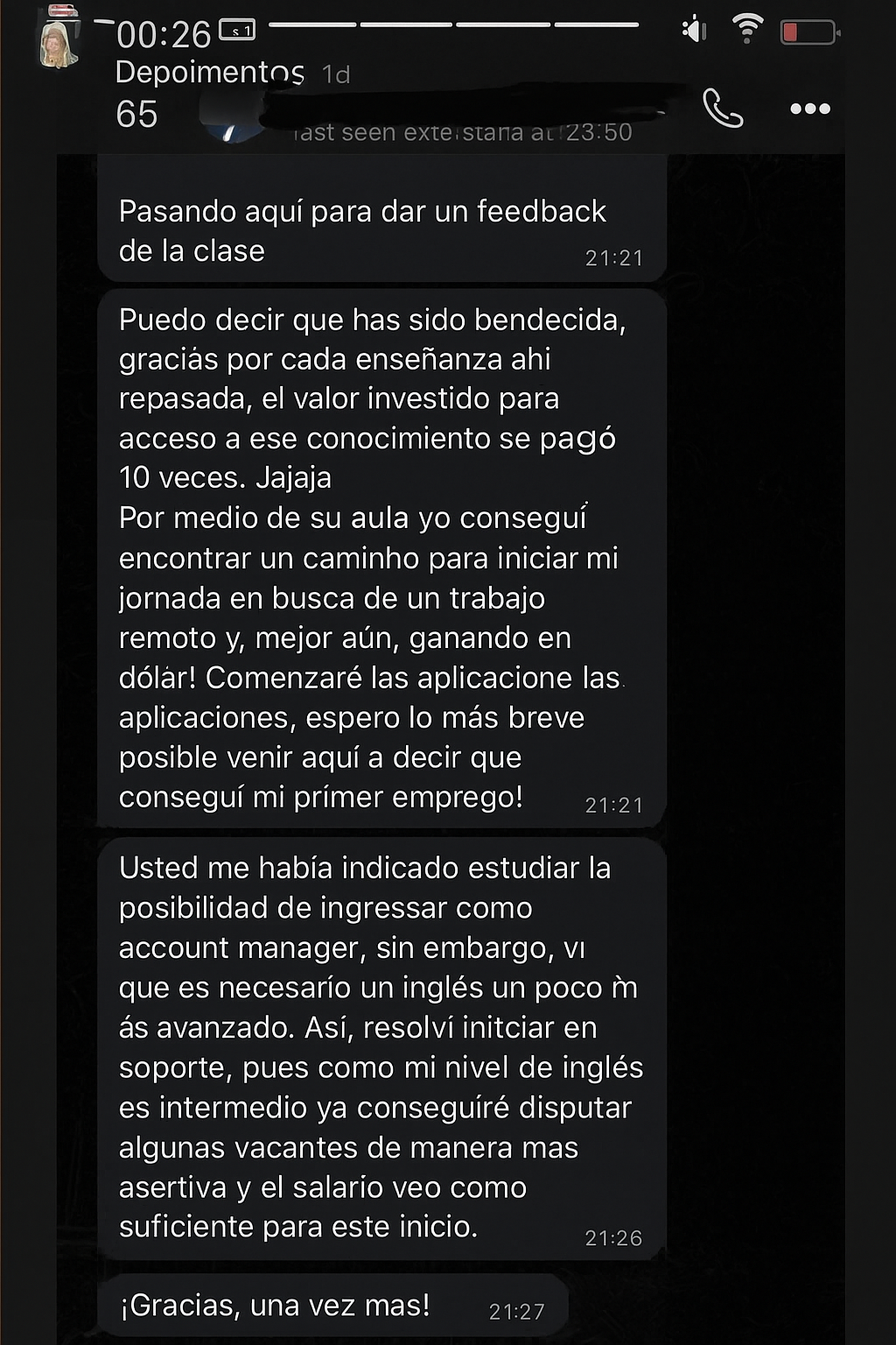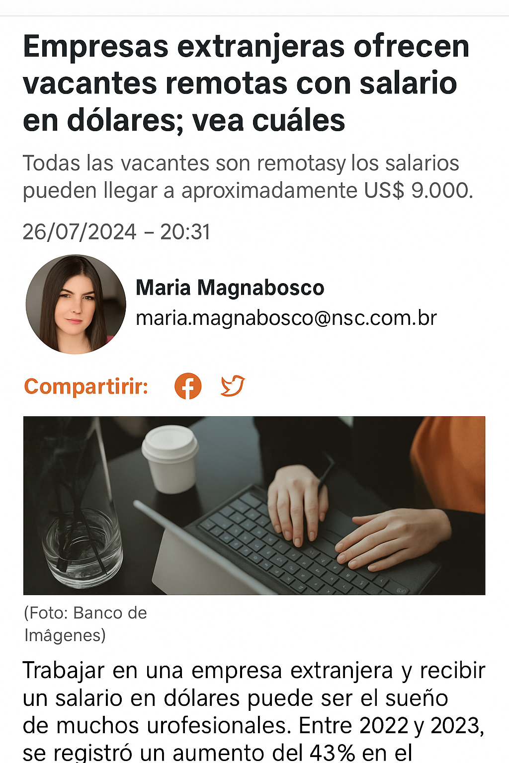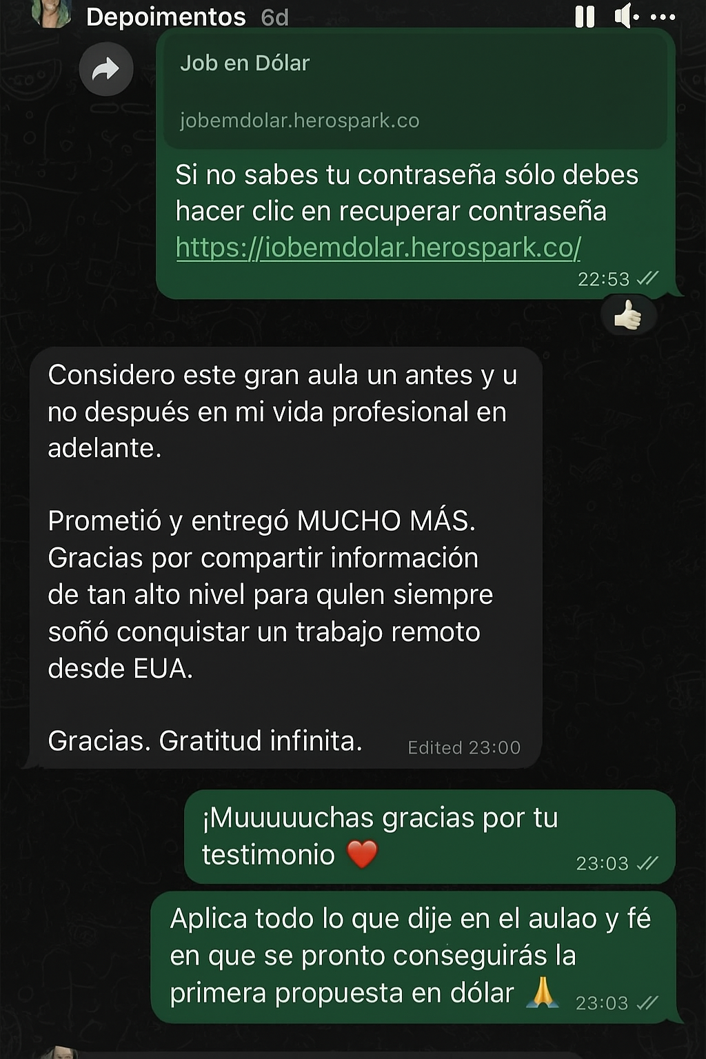 "Job en Dólares transformó mi carrera! Nunca imaginé que fuera posible ganar en dólares trabajando desde casa. Ahora trabajo de forma remota para una empresa estadounidense y estoy construyendo mi estabilidad financiera."